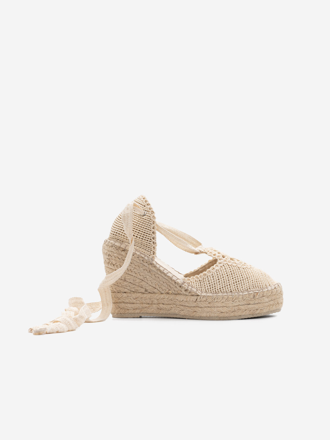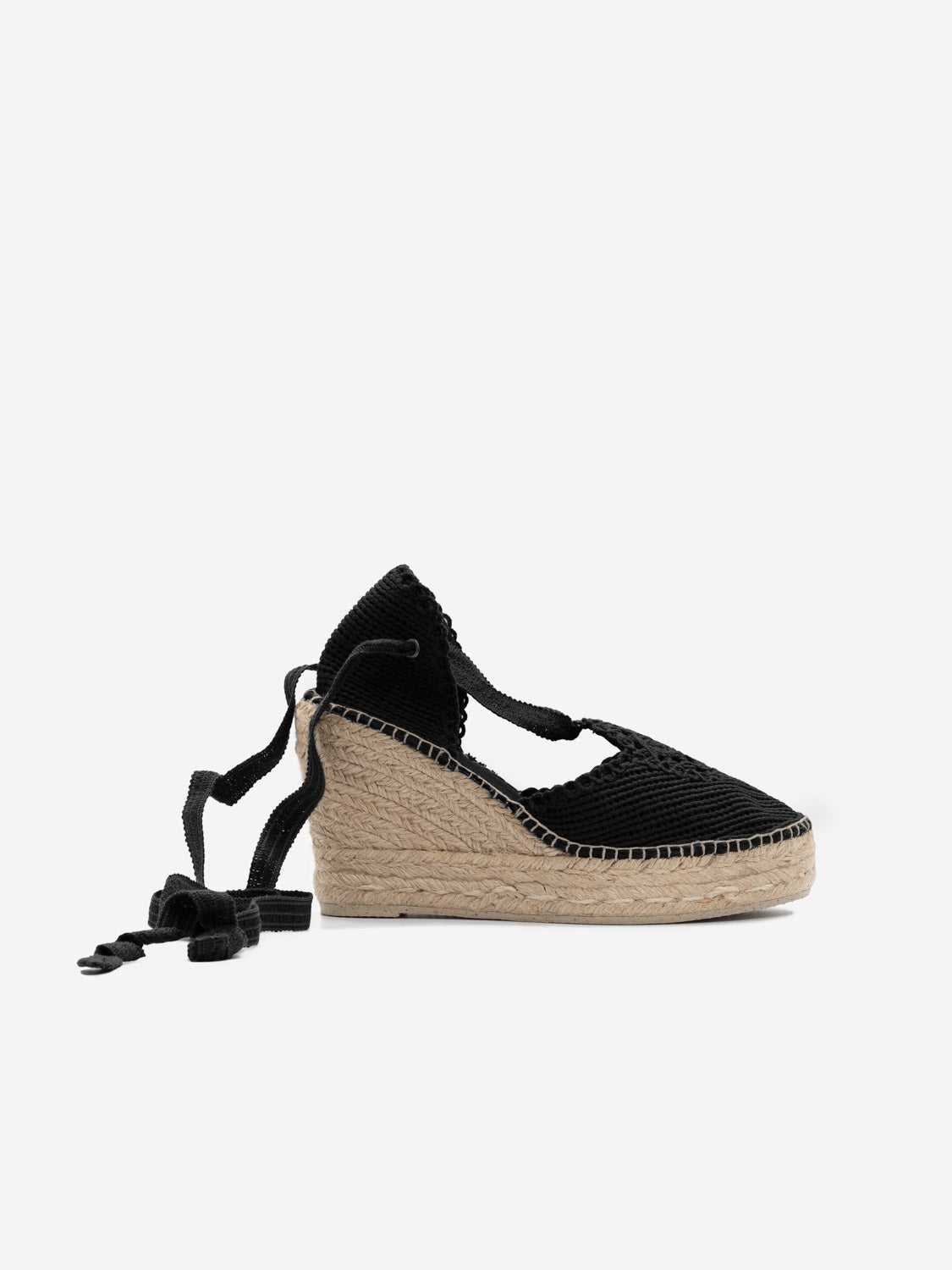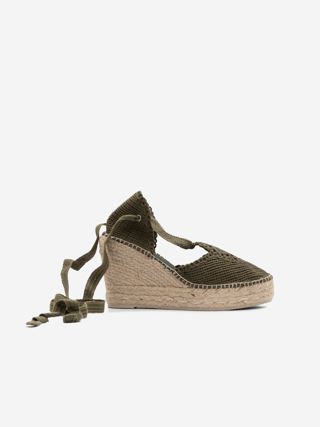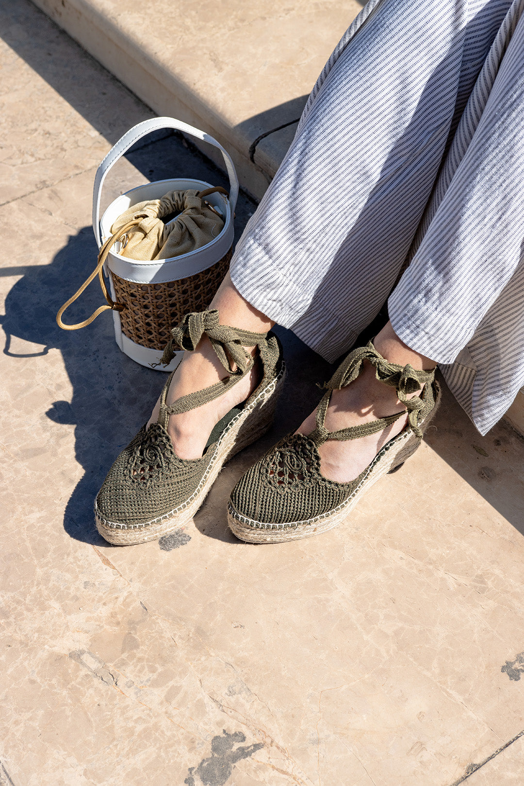 ¡Descubre a Lou! Esta cuña alpargata de siete cuerdas eleva la esencia mediterránea a un nivel de sofisticación superior. Su diseño destaca por un exquisito tejido en croché artesanal de color beige, negro y kaki donde cada puntada revela un trabajo minucioso y un profundo respeto por la tradición del calzado.